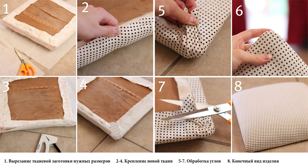 Натягивать материал нужно тщательно, и хорошо, если у вас есть помощник. Ткань должна быть натянута одинаково во всех местах, со всех сторон и в каждом направлении. Тогда изделие будет выглядеть аккуратно, обивка не деформируется со временем. Закрепить обивку проще всего мебельным степлером, но можно и по старинке – при помощи гвоздиков и молотка.
