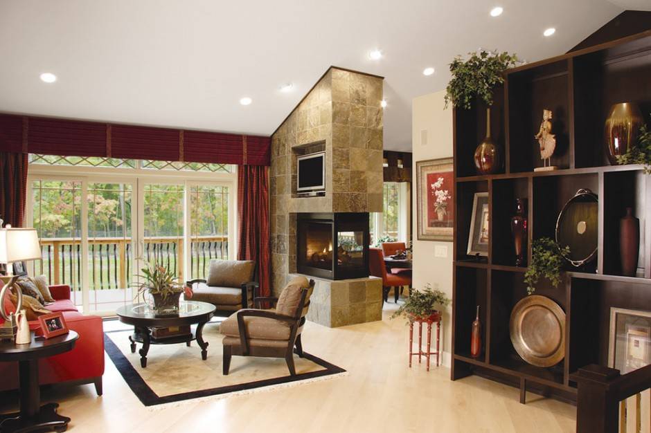 Трехсторонний камин желательно обустроить так, чтобы использовать его с максимальной эффективностью. Все выступающие части стоит оформить под полки, на которые удобно выставить предметы декора. Камин в интерьере небольшой комнаты должен занять угловое пространство. Вовлечение в процесс декорирования пассивных частей стен поспособствует визуальному расширению комнатного пространства и наполнит его легкостью.