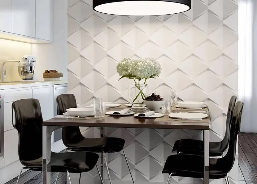 В рабочей зоне также можно применять трехмерные обои, например, вместо стандартного кухонного фартука. Чтобы материал не марался, сверху его покрывают слоем прозрачного стекла. Лучшими вариантами станут морские картинки, фото растений, абстракция. Если столовая и кухня совмещена, в комнате может быть только одна зона с 3D-обоями.