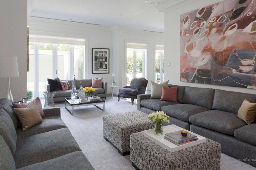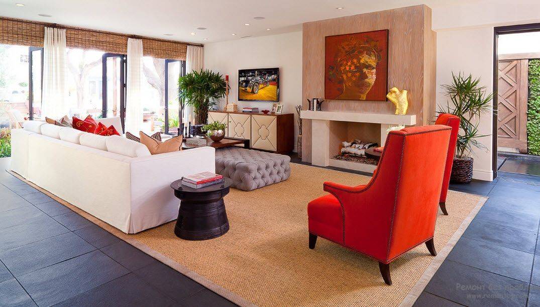 Второй – когда отдельные элементы – а это могут быть пуфы – контрастируют с остальной обстановкой и создают акцент.
