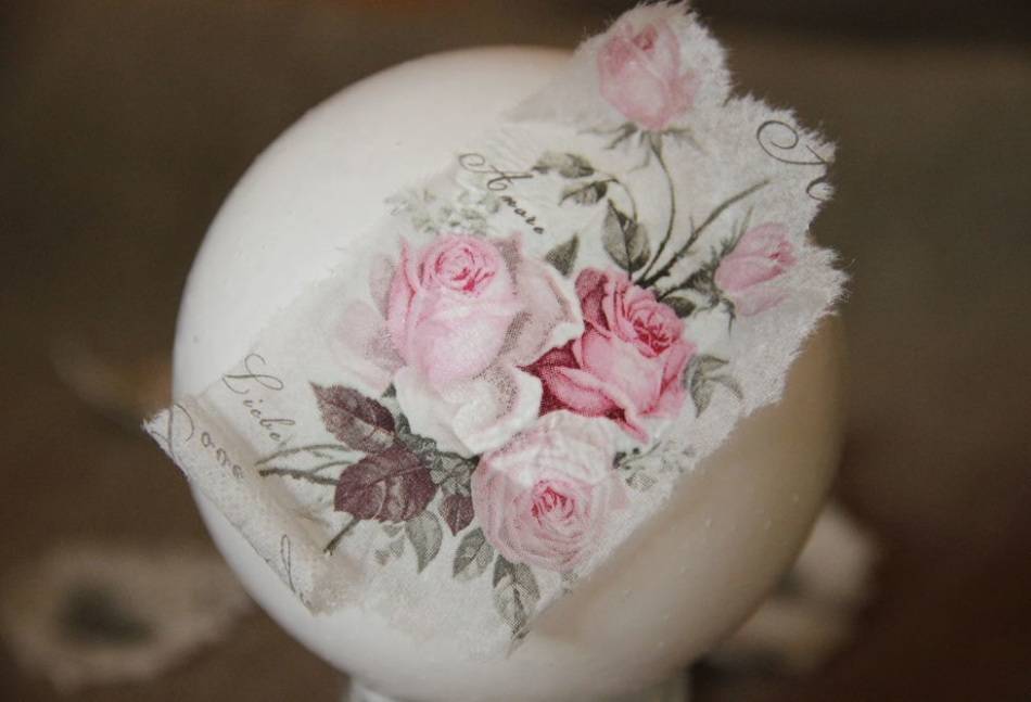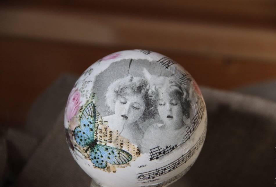 Данный вариант кажется декупажа некоторым сложным, ведь обклеить поверхность сферическую без возникновения складок непросто. Но следующим возможно образом: