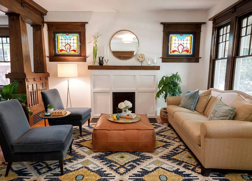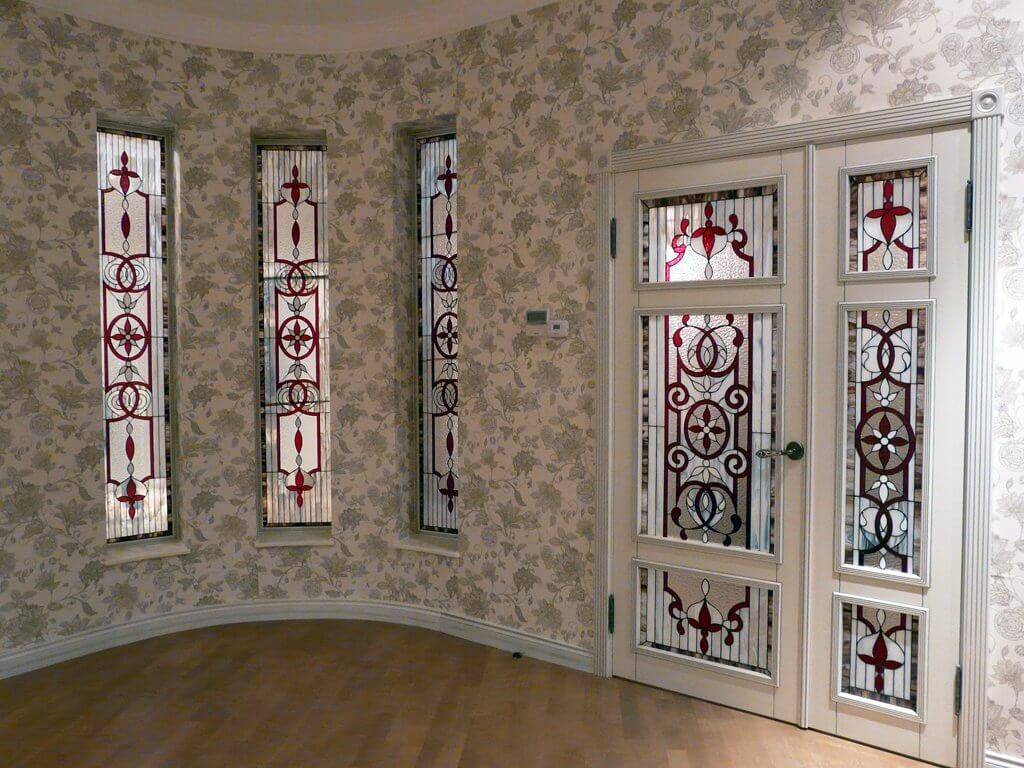 Гостиная. Элементы витража могут быть выполнены в любом цвете; они идеально вписываются в стиль арт-деко, барокко, модерн, классический. Популярные техники — Тиффани, заливка, фацет, фьюзинг, пленочная.