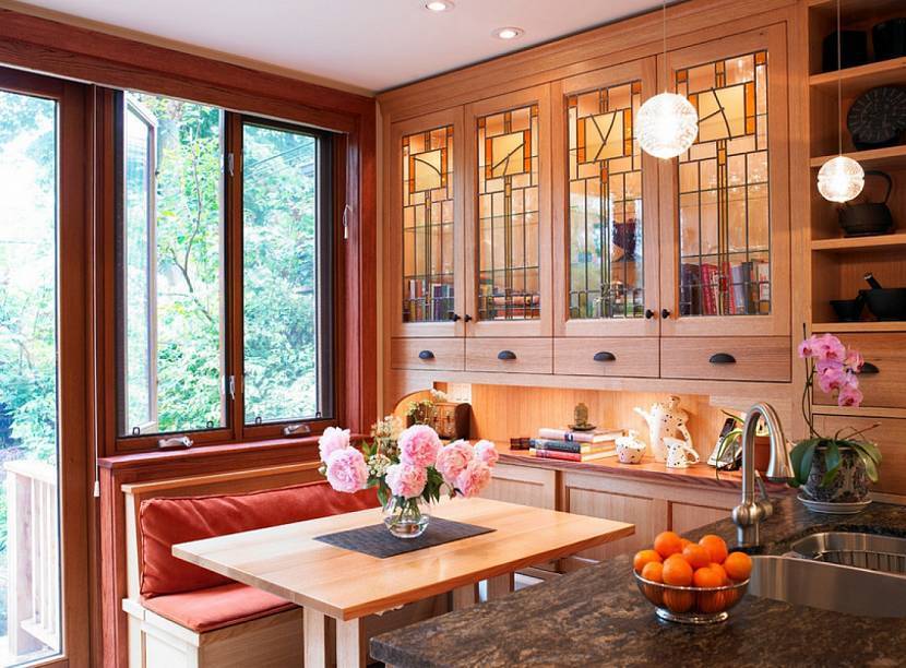 Кухня. Ни одна хозяйка не откажется от атмосферы праздника, создаваемой ярким витражным декором с растительными или геометрическими мотивами. Вариантов использования масса: окна, двери, фасады мебели, кухонный фартук.