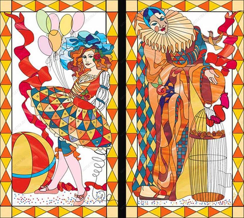 - рисованный (заливной) витраж: после нанесения контура прозрачная поверхность покрывается красками, результатом является рисунок, копирующий изначальную витражную технику.
