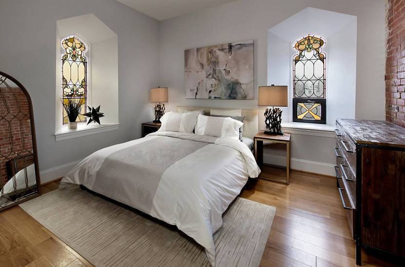 Окно с витражами нужной степени создает ощущение изолированности и подходит для дизайна любого помещения