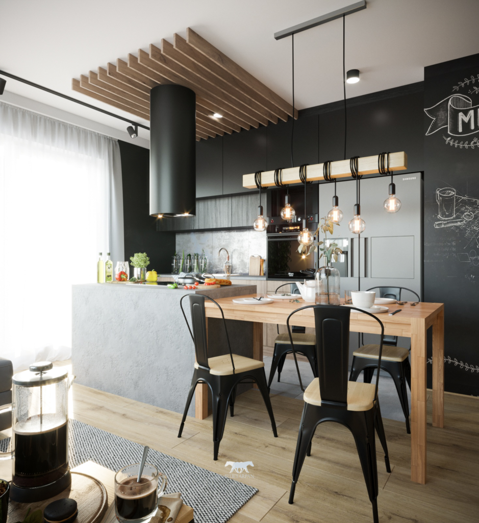 Ощущение простора достигается с помощью широкого дверного проема. Лучше всего установить раздвижную дверь. Трудно придумать более подходящий вариант для разграничения кухни и гостиной, но лишь в том случае, если внешний вид двери соответствует дизайну этих помещений.