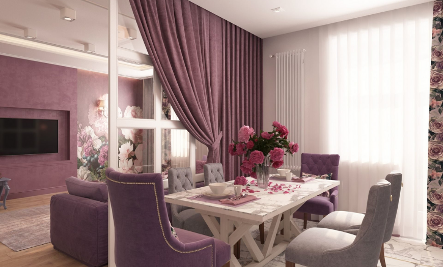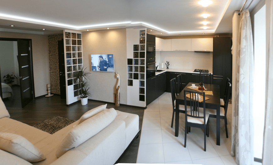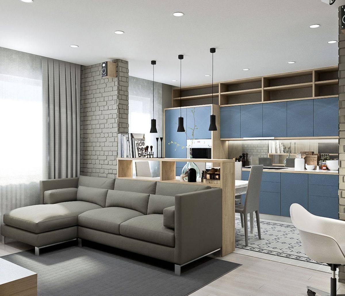 Другой вариант – выбрать 2-3 основных цвета и повторить их по всему пространству гостиной-кухни или квартиры-студии. Такие решения будут сглаживать резкий переход между зонами в пространстве.