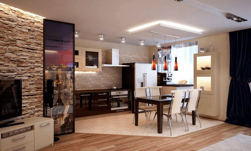 Современная гостиная с кухней не должна быть полностью открытой. Обычно границу устанавливает кухонный остров, барная стойка, шкафы, стол со стульями, а часто диван. Если вы хотите, чтобы граница между кухней и зоной отдыха была более четкой, то можете ввести раздвижные двери, которые могут заменить стену, разделяя кухню и гостиную. Полупрозрачные стеклянные двери позволят адекватно осветить совместную комнату.