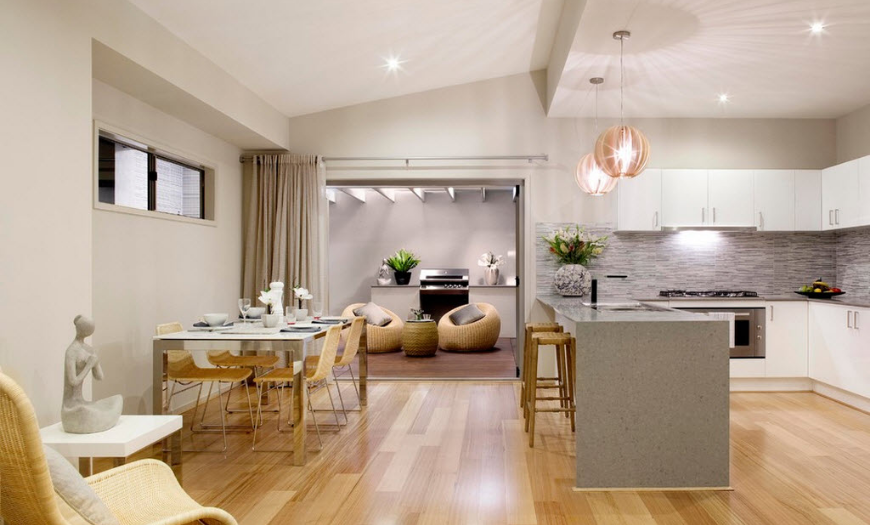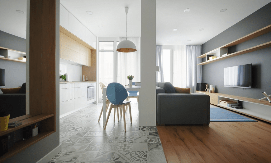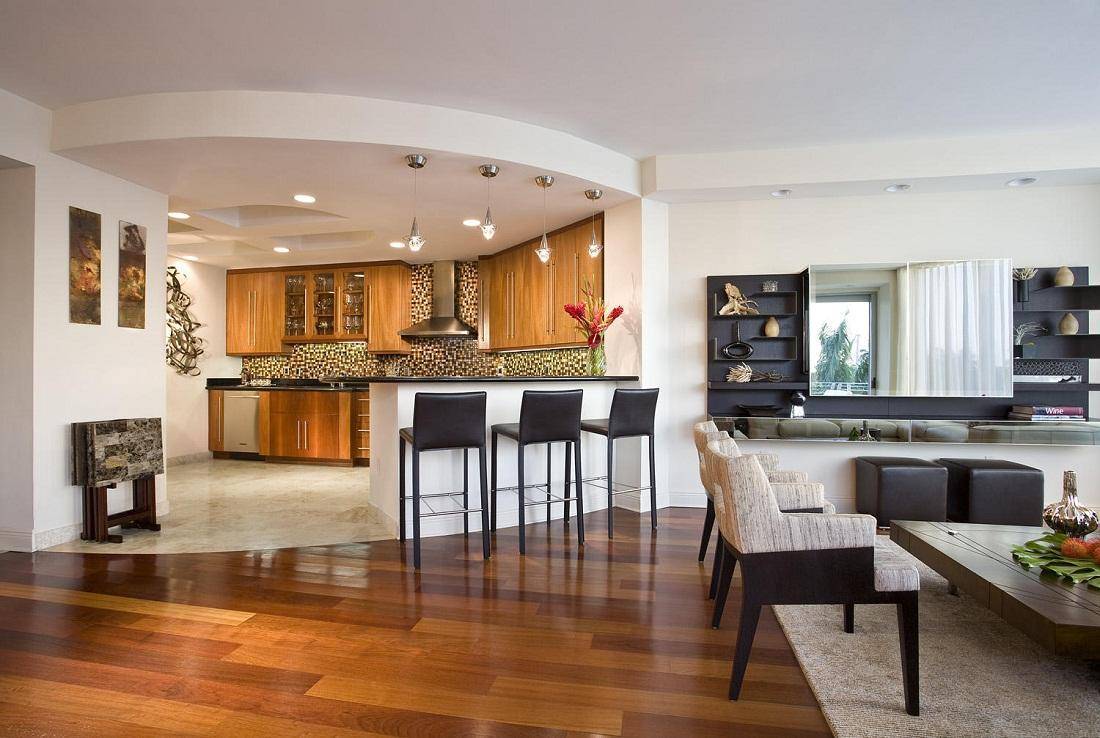 Наиболее распространенные решения в этом типе договоренности — зонирование кухни и гостиной. Это можно сделать, правильно расставив мебель. Границей может быть диван, кухонный остров, бар или стол. Стеклянные и складные стены, например, гармошка, также все чаще встречаются. Другой вариант установить границу — изменить напольное покрытие, сочетая дерево в гостиной с плиткой на кухне.