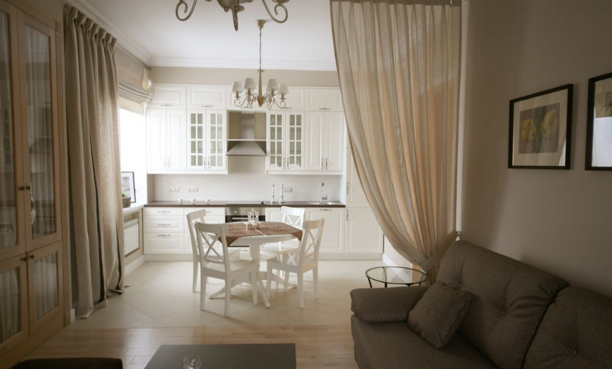 Для кухонной части подойдут жалюзи, а для гостиной – шторы, сочетающиеся с дизайном всего помещения