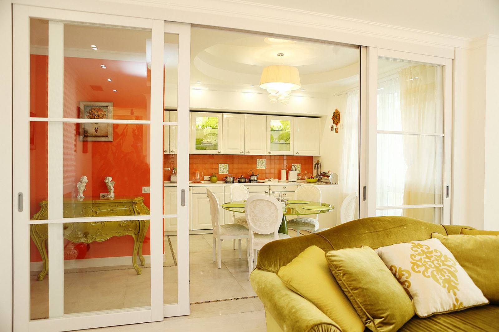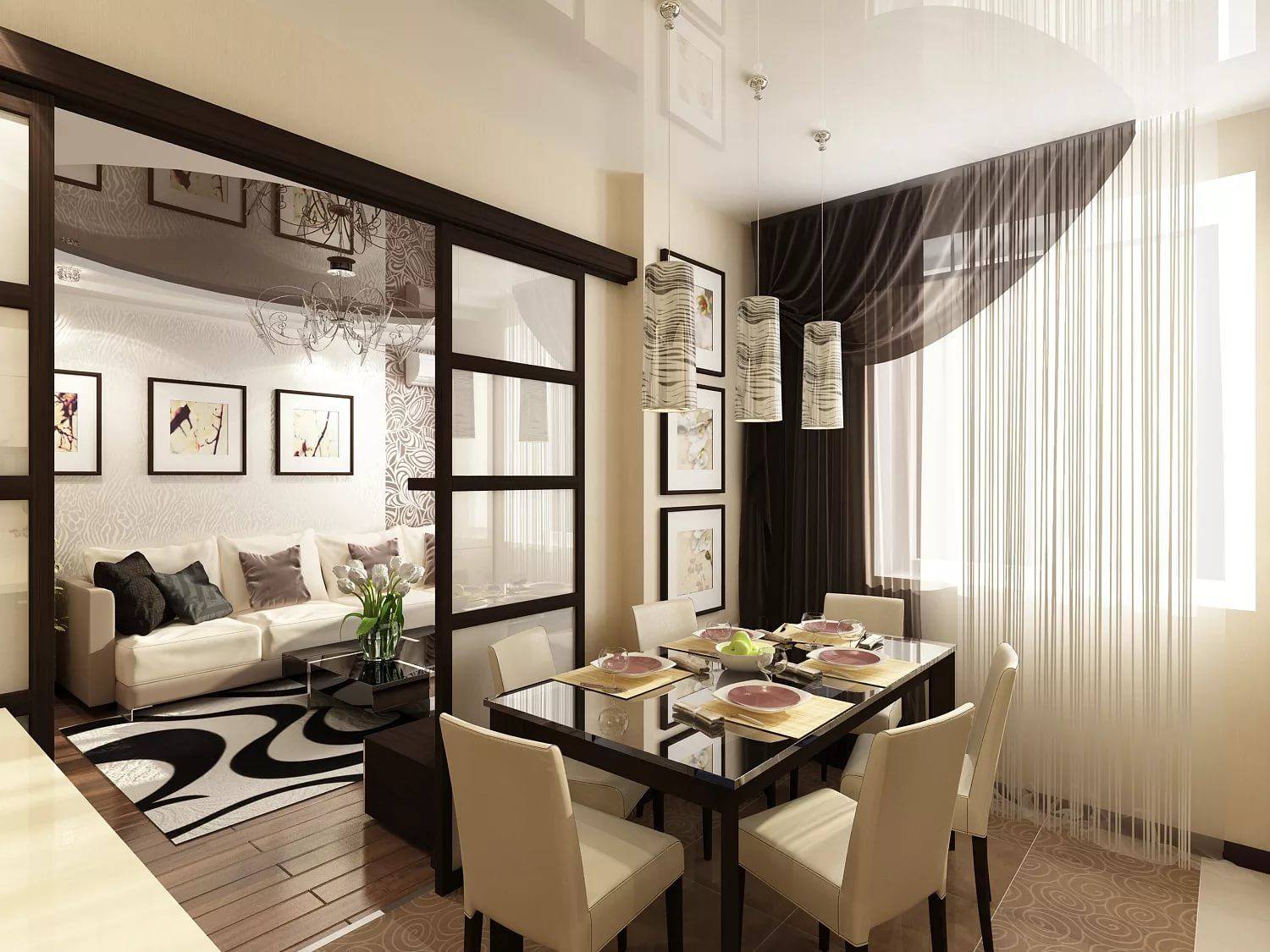 Для разделения гостиной на зоны неплохим и изящным вариантом будет установка прозрачных дверей до потолка, стекла которых могут быть декорированы в любом стиле.