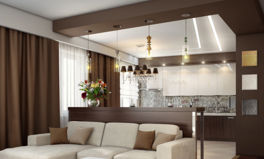 Зонировать гостиную можно и при помощи перегородок, разноуровневого освещения, отделки потолка.