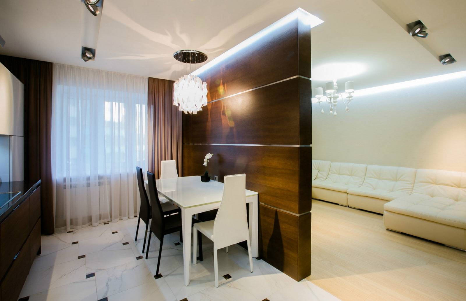 Ещё одним способом разделения гостиной на функциональные зоны может стать выполнение потолка и пола в разном дизайне. Благодаря этому современному приёму в организации пространства комнаты, получается очень стильный интерьер.