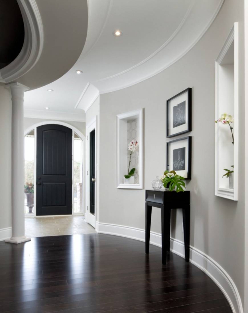 - Горизонтальные углубления хорошо смотрятся в длинном холе или коридоре. Над ними устанавливаются точечные светильники. Гармонирует с подобным декором кирпичная кладка. В таких нишах размещаются фотографии в стеклянных фоторамках, или оригинальные полки под сумочки или шляпы. Подойдет вариант и для небольшой гостиной, оформленной в итальянском стиле. Ниши горизонтального типа органично сочетаются с низкой мебелью. При этом лепнина дополняет композицию.