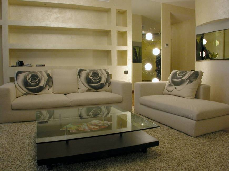 - Над диваном. Несквозные проемы прямоугольной или квадратной формы, расположенные над диваном, выгодно подчеркивают геометричность помещения и дисциплинируют его.