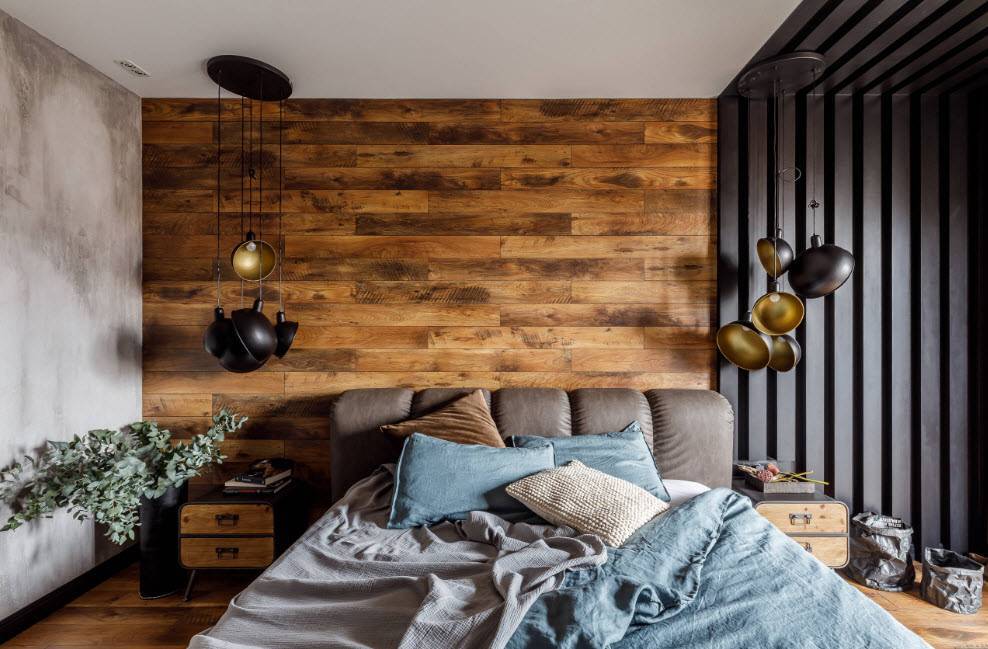 Одновременно старинный и современный стиль. Подходит для узких спален с окнами и без. Характерная черта — наличие кирпичной стены. Если такой эффект организовать невозможно, выполняют имитацию. Ее создают с помощью кусочков пенопласта или специальных пластиковых панелей.