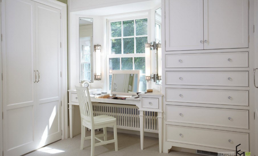 Приветствуется установка туалетного столика с полукруглым зеркалом.