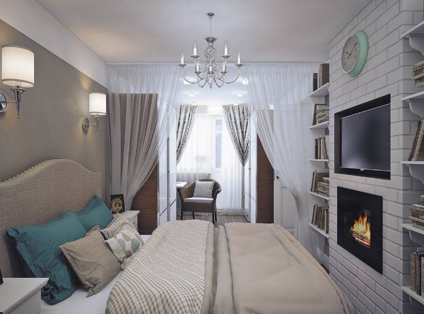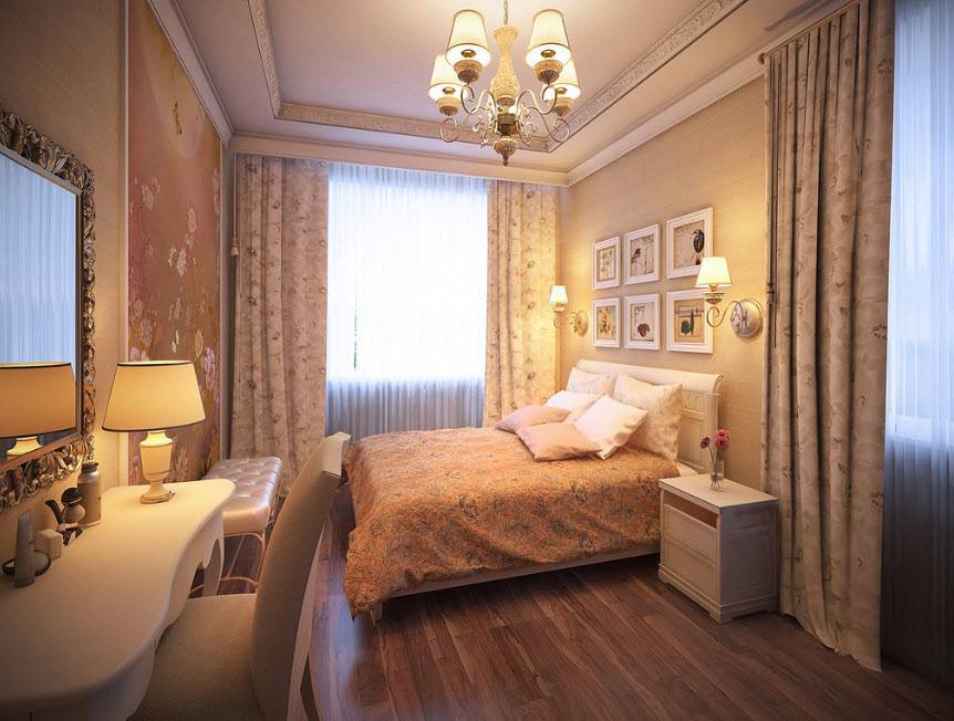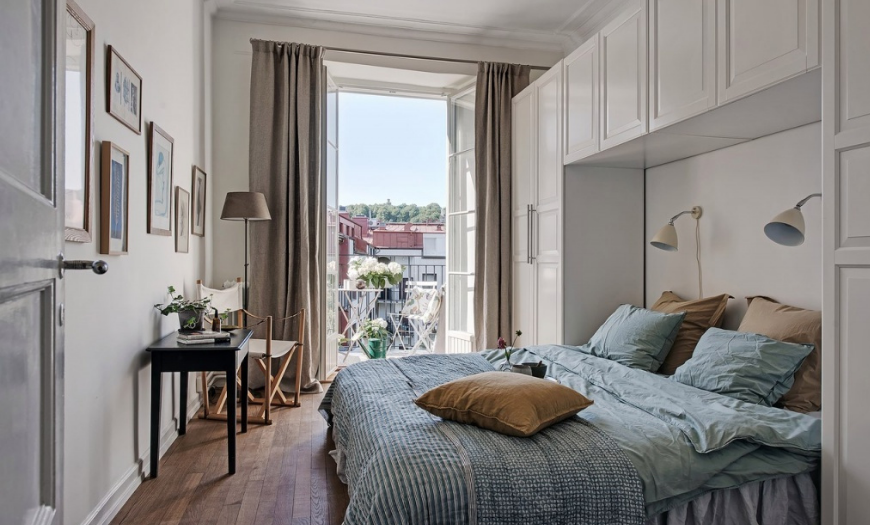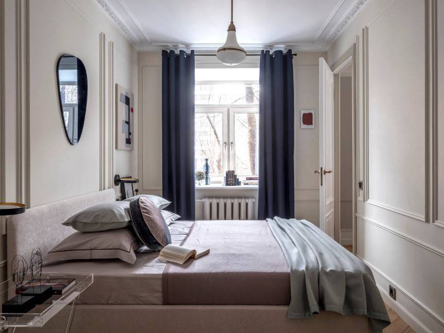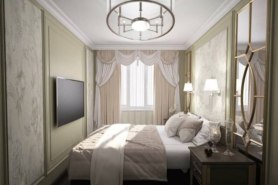 Классическая узкая спальня с интересным оформлениемИсточник comfortoria.ru