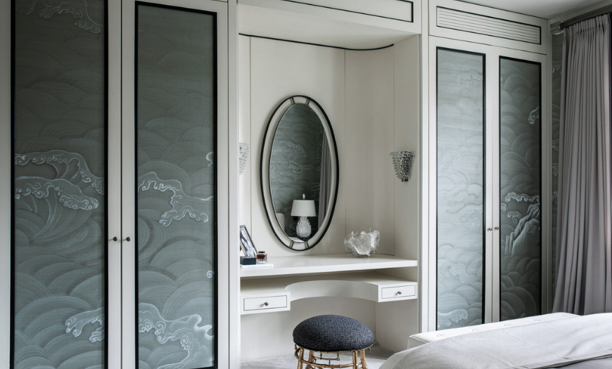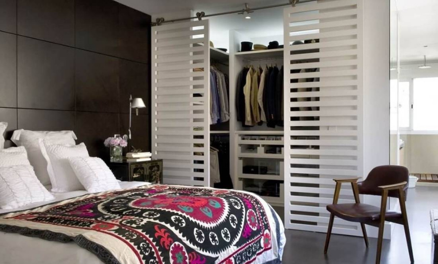 Оптимальное решение — встроенный шкаф-купе. Внутренний объем позволит разместить все необходимое, а дверцы открываются без помех. Шкаф можно оформить в той же цветовой палитре, что и стены, или украсить зеркалами.