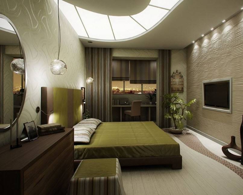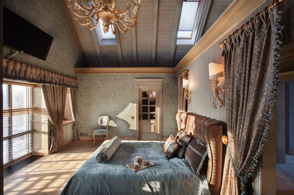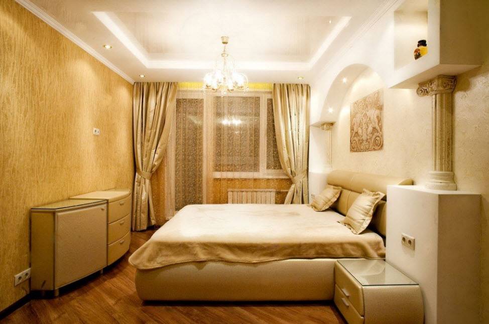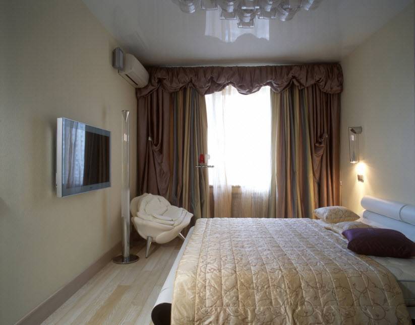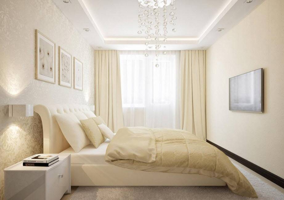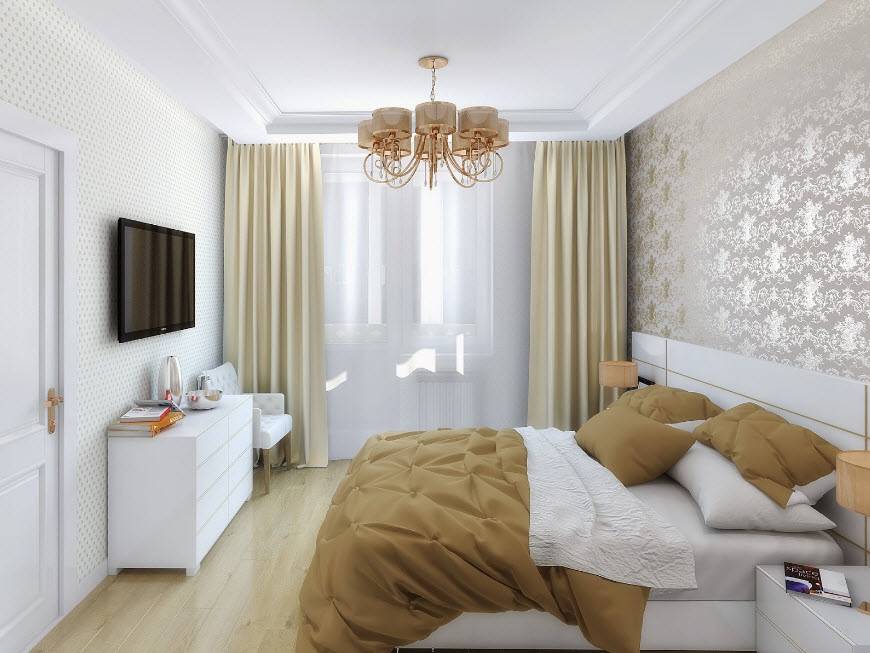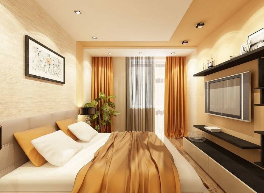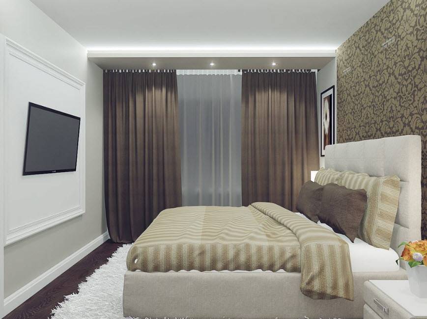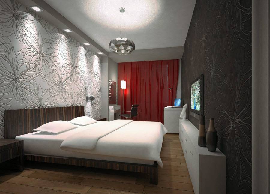 При оформлении прямоугольной опочивальни стоит учитывать недочеты этого помещения: длина в сочетании с небольшой шириной, высокие потолки.