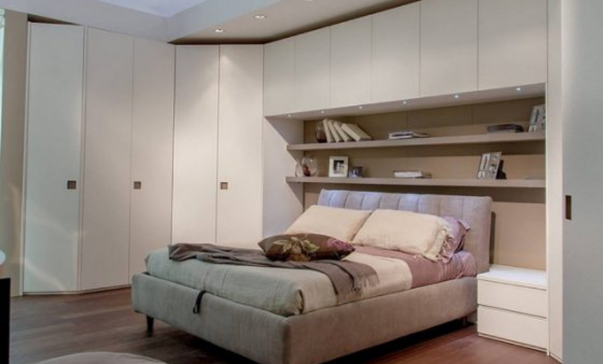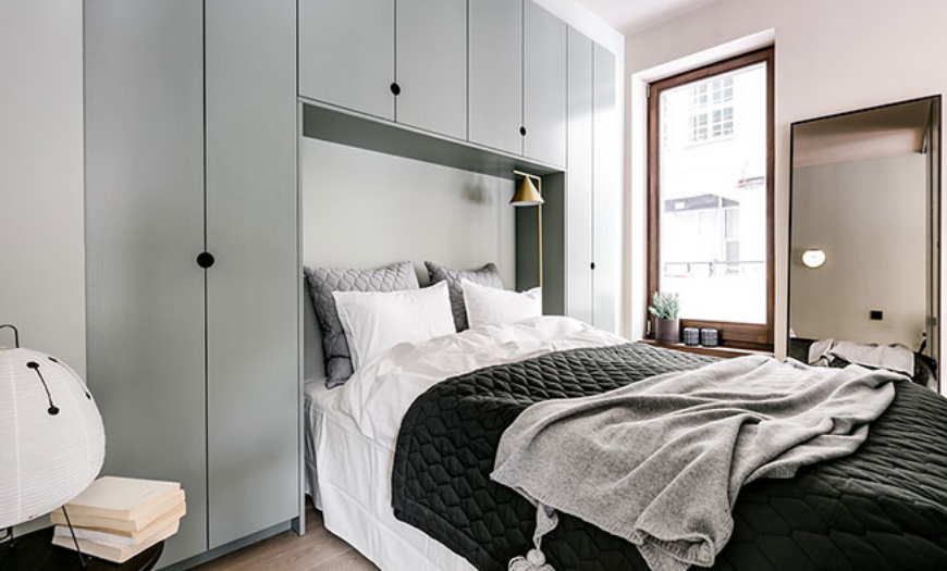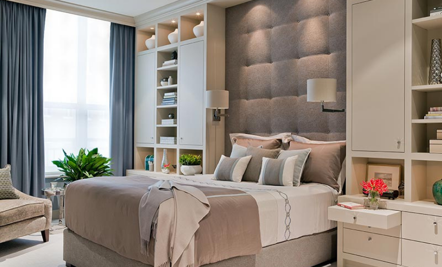 Наличие мест для хранения постельного белья, пижам и прочего является необходимостью. Чтобы рационально обустроить пространство узкой спальни, часто задействуют стену в изголовье кровати. В этом участке размещают подвесные шкафчики и полочки. Это может быть целый шкаф (либо стеллаж) в форме буквы П, словно «опоясывающий» спинку кровати. Такая конструкция является весьма удобным и практичным решением для компактной спальни. Сделайте чертеж своей комнаты на бумаге и поэкспериментируйте с конфигурацией и размещением различных полок и подвесных систем. Если есть ниша или углубление, стоит монтировать встроенный шкаф.