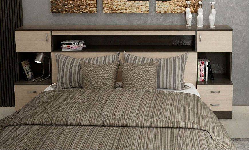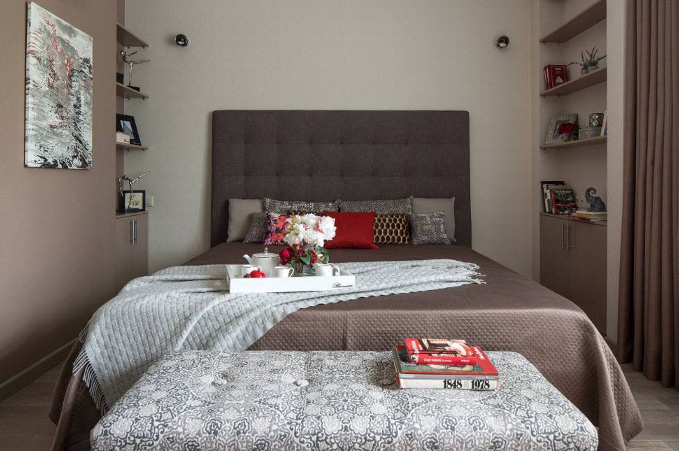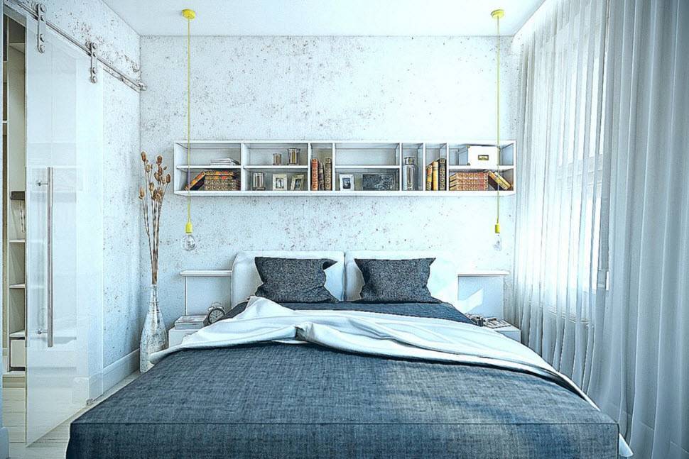 Чтобы сэкономить место прикроватные тумбочки можно заменить полкой, расположенной над изголовьем кровати или между кроватью и стеной.