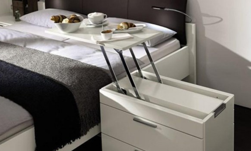 Если позволяет выбранный стиль оформления спальни, от них можно отказаться, заменив на навесные полки. Есть варианты размещения необходимых мелочей во встроенном в изголовье кровати мини-комоде.