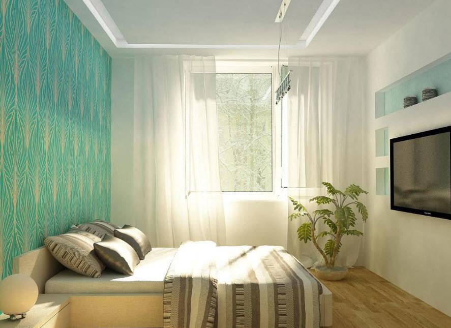 Не менее привлекательно выглядит спальня комната, оформленная при помощи природных оттенков (голубого, коричневого, хвойного). Они создают особую атмосферу уюта, сближая человека с его естественной средой. Скорректировать геометрию длинной спальни помогут цветовые комбинации. Например, узкую стену можно окрасить в насыщенный цвет, а прилегающие стены оставить светлыми и однотонными.