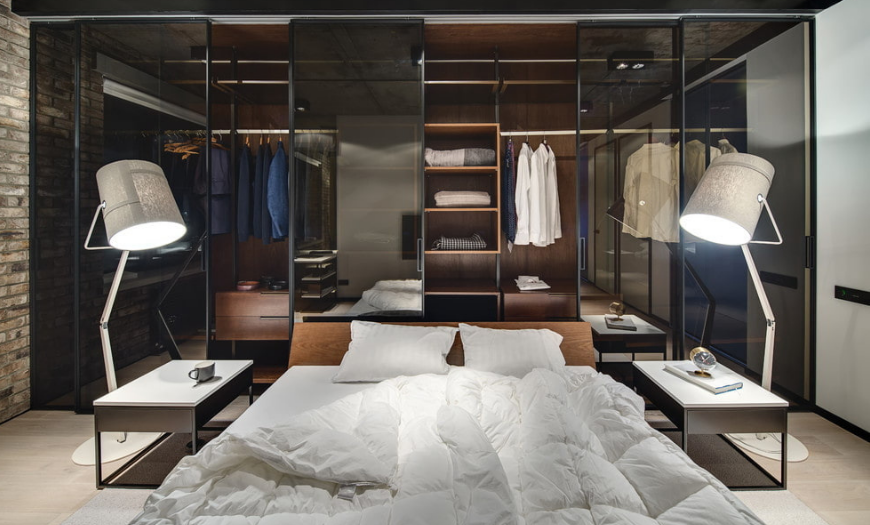 Кровать в узкой спальне со стилем лофтИсточник design-homes.ru