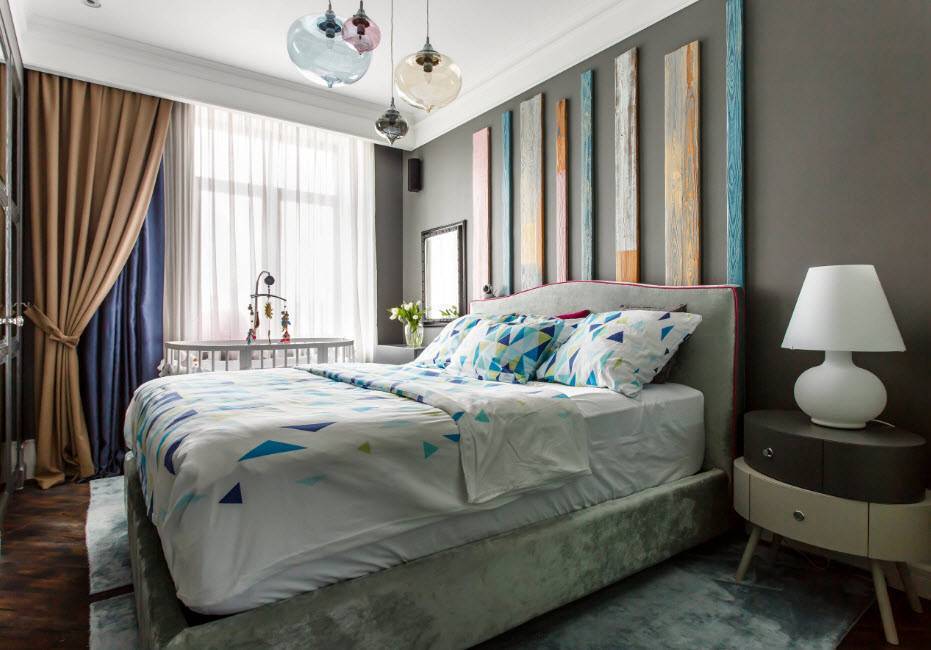 Для разнообразия атмосферы помещения стоит акцентировать внимание на одной из стен, лучше за изголовьем спального места.