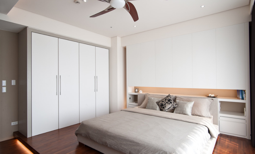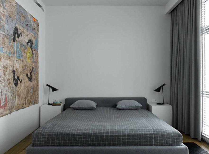 Небольшая спальня в стиле минимализм подразумевает размещение функциональной мебели. Допускается совмещение зеркал, выезжающих створок и шкафчиков. Рекомендуют в дизайн узкой спальни встраивать полки, тумбочки и ящики. Все эти детали должны быть выдержаны в едином оттенке. Фурнитура каждого из предметов должна соответствовать интерьерному решению: никаких вычурных деталей, фигурных ручек.