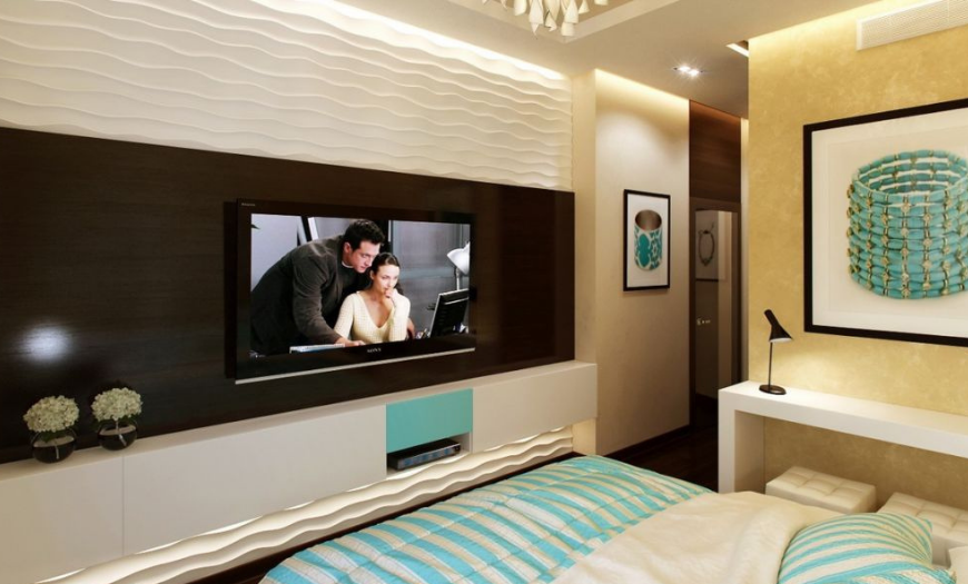 Существуют противники и сторонники размещения телевизора в зоне отдыха. Если вы относитесь к последним, то ставить ТВ надо так, чтобы его было удобно смотреть. Лучше всего повесить с помощью кронштейна на стену напротив кровати.