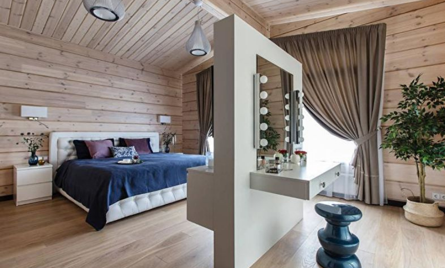 Если узкая спальня отличается большой длиной, можно разбить пространство на две зоны. Для разделения зон используют элементы, расположенные поперек комнаты: например, стеллаж, тумбу с телевизором, мини-диван или кресло со столиком. Возможен вариант и с тканевой шторой, выполняющей функцию разделителя. Такое зонирование делает спальню уютнее и гармоничнее.