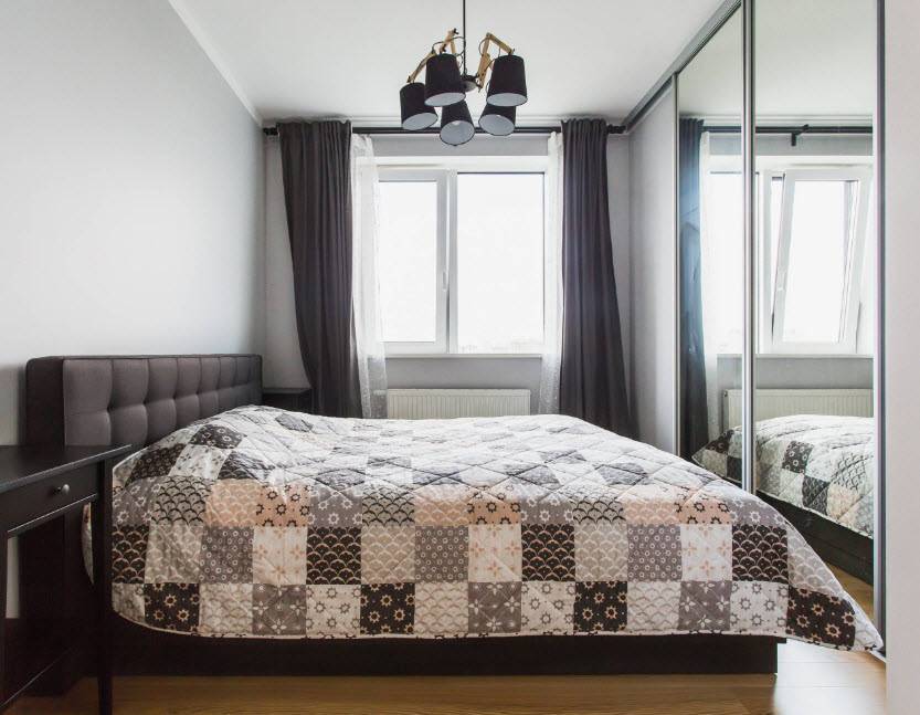 Особую трудность представляют спальные комнаты, ширина которых составляет порядка двух метров. Все дело в том, что стандартная длина матраса составляет около двух метров, при этом кровать еще длиннее. Исходя из этого, кровать даже теоретически не станет поперек комнаты и ее можно расположить только вдоль спальни. При этом сбоку останется лишь 0,2-0,3 метра, но даже этого достаточно в такой узкой комнате.