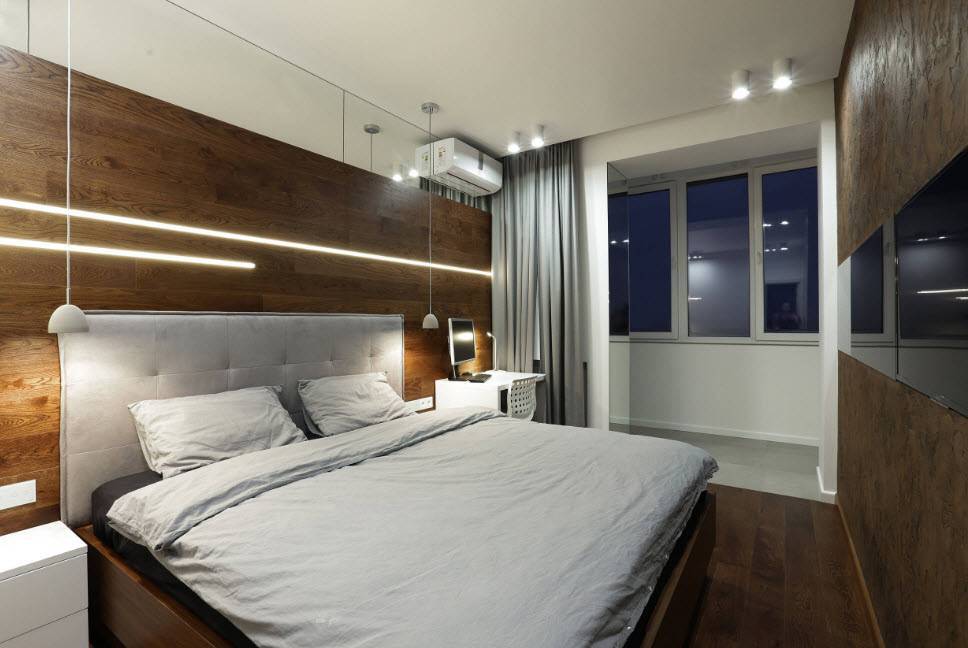 Прямоугольная спальня с балконом – это находка для дизайнера. Дополнительные квадратные метры открывают множество возможностей. Можно убрать разделяющую ограждающую конструкцию и расширить комнату за счёт присоединения к ней площади лоджии. У подобного решения есть один минус – оно требует согласования с различными инстанциями.