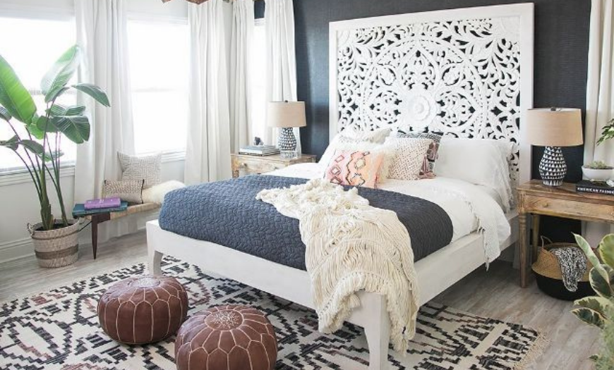 В таком стиле интерьера предпочтительнее использовать светлые тона и акцентировать внимание на спальном месте. Для этого используют декорирование подушками, накидками и покрывалами