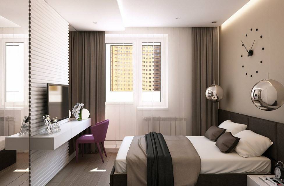 Что касается окон, то их в длинной спальне может быть несколько или же только одно. В комнате с одним окном все просто, ведь мебель располагается в независимости от его размера и расположения, а вот в помещении с двумя окнами нужно отталкиваться от их типа и места, что вызывает дополнительные трудности. Если спальная комната имеет доступ к лоджии, то нужно постараться их объединить, увеличив пространство за счет сноса стены. Утеплив помещение можно создать в полученном пространстве зону для хранения вещей, рабочий стол или гардеробную.