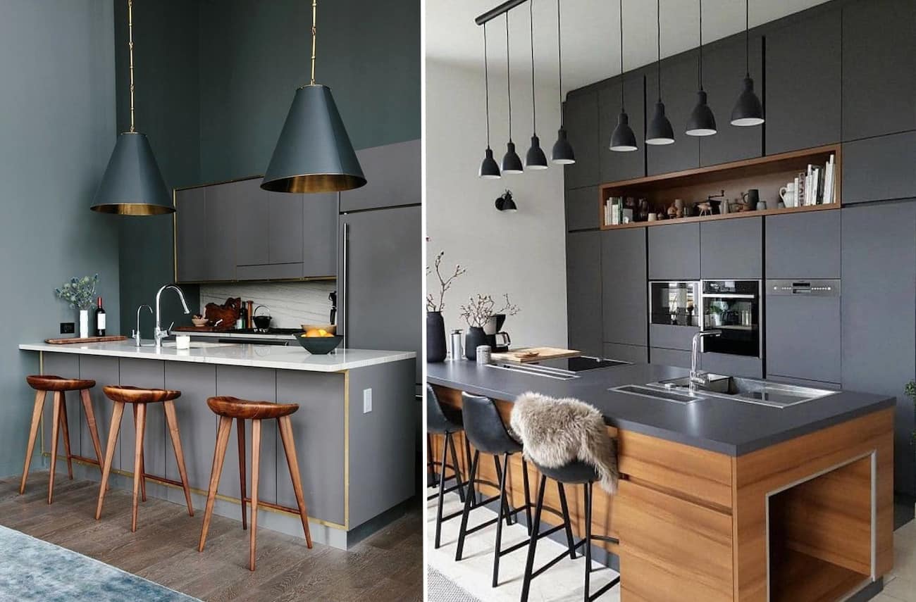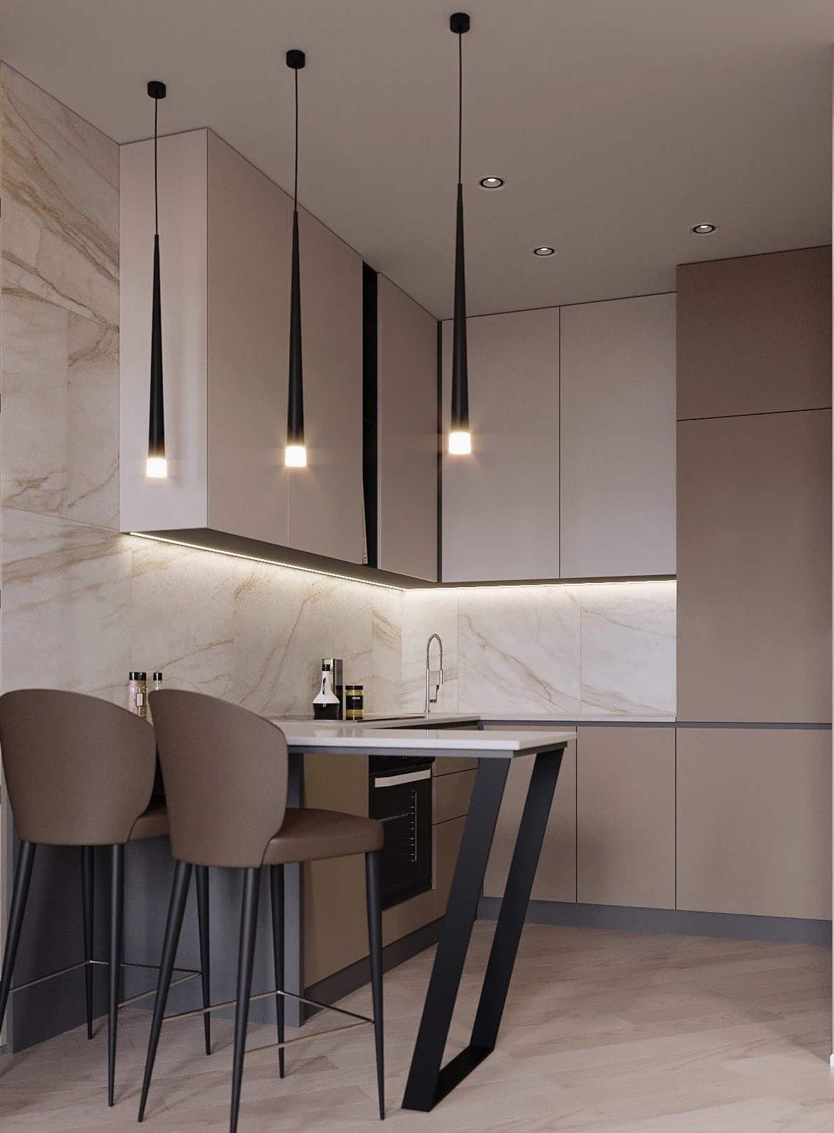 Подвесные светильники хорошо вписываются в интерьер маленькой кухни с высокими потолками