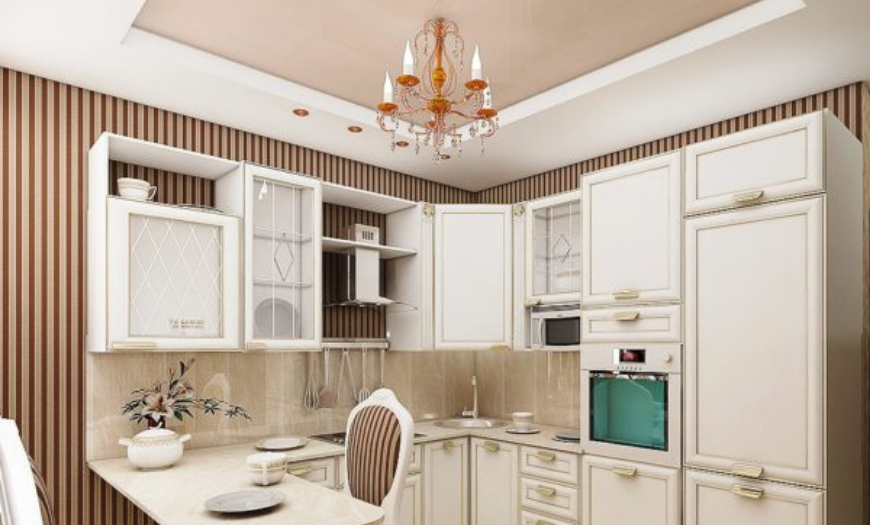 Сочетание современной мебели и элементов классического стиля позволяет получить новое, подходящее для дизайна маленькой кухни направление – неоклассику.