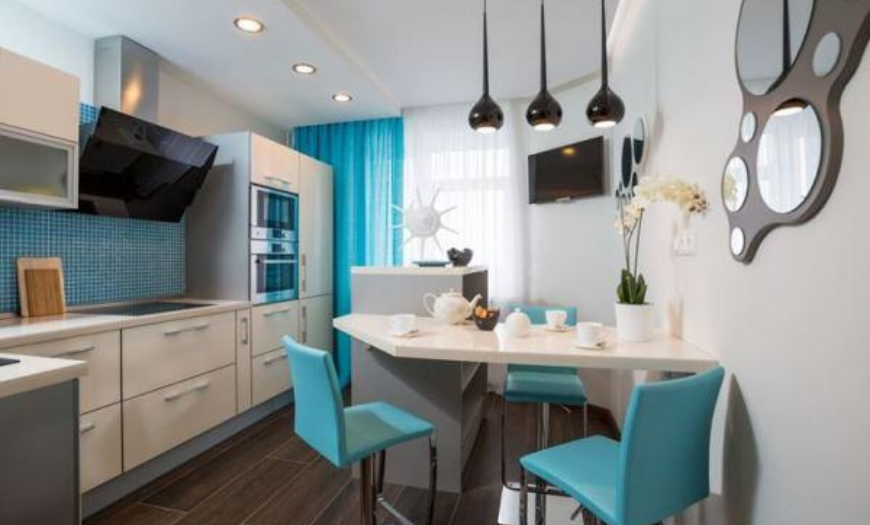 Установка барной стойки — оптимальный выбор для узкой кухни, где для обеденного стола не остается места. В такой ситуации небольшую барную стойку оборудуют у стены с окном, для удобства можно сделать ее откидной.