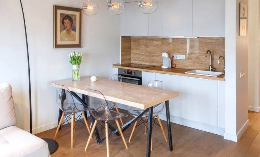 Для того, чтобы оборудовать компактную обеденную зону для семейной пары, можно воспользоваться нехитрыми секретами и задействовать пространство угла, расположенного непосредственно у двери или установить узкий кухонный стол напротив рабочей зоны кухни.
