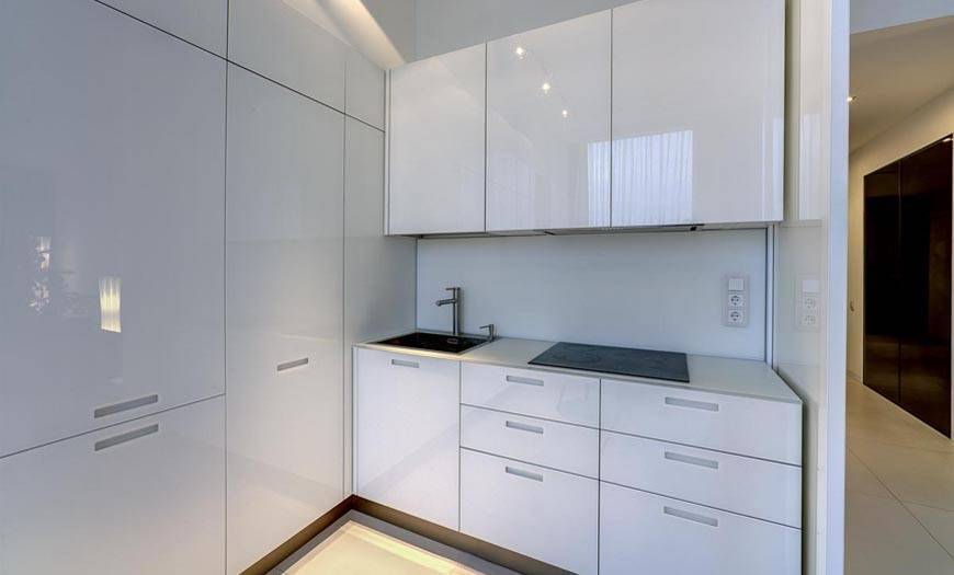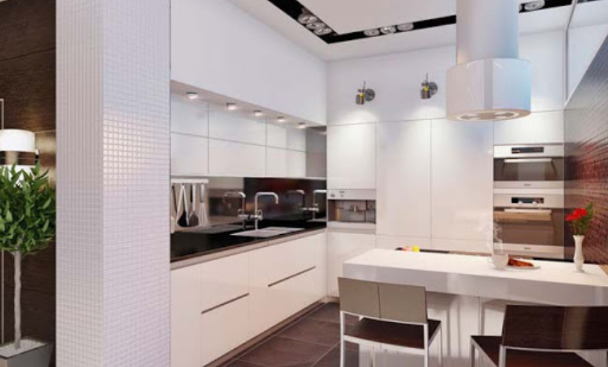 Для визуального углубления перспективы, кухню-студию, можно оформить гладкими светоотражающими поверхностями. Например, в виде глянцевой плитки, отполированного камня, лакированных или ламинированных с помощью ПВХ-пленки, фасадов кухонного гарнитура, хромированной техники или других аксессуаров.