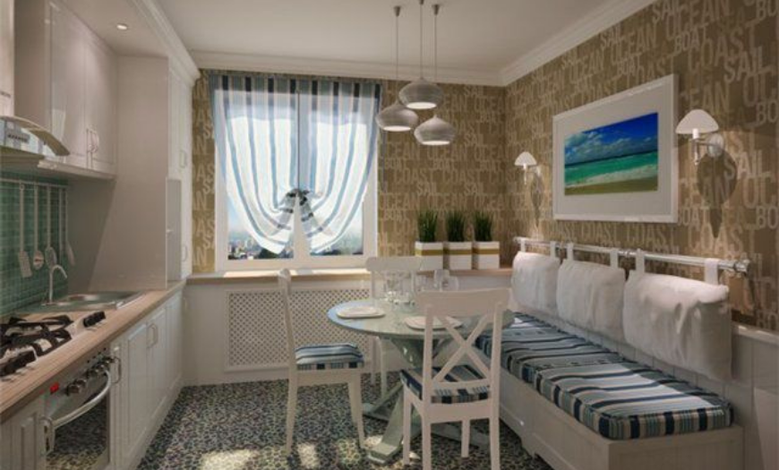 Можно окрасить стены в бежевый, песочный, любые оттенки синего, оформить фартук мозаичной плиткой, добавить мебель «под дерево» или универсальных серого или белого цветов.