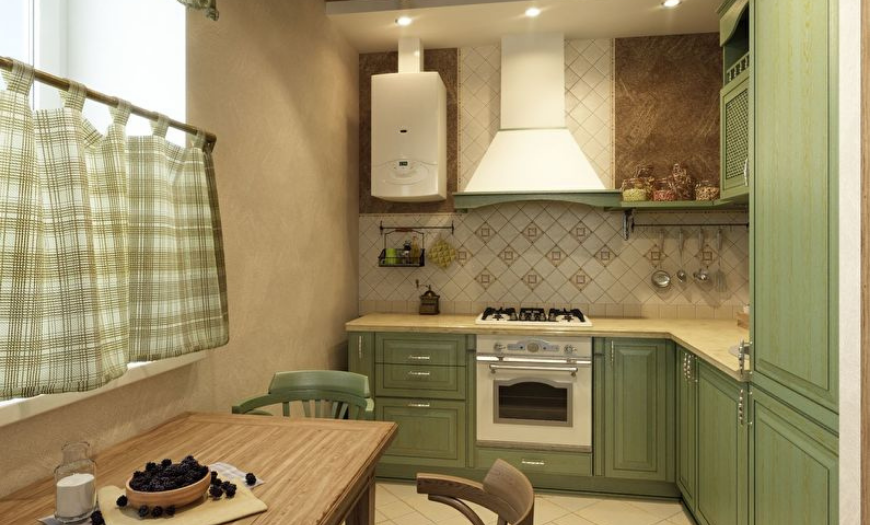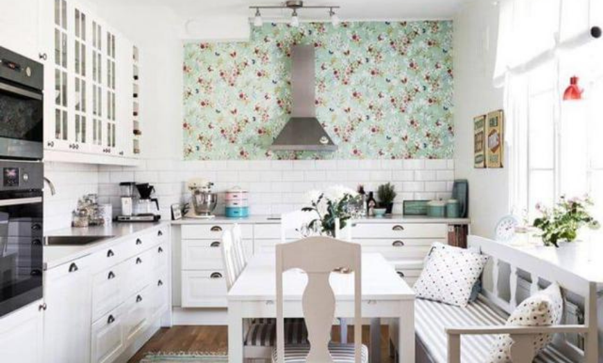 Этот стиль может быть легко адаптирован под реалии комнаты 6 кв м. Пастельные тона прованса сыграют на пользу маленькой кухне, а вот с декором и открытыми полками нужно быть аккуратнее – не захламляйте пространство лишними деталями. В качестве украшений будет достаточно скатерти, вазы с высушенной лавандой, подушек на стульях и легких хлопковых или льняных занавесок.