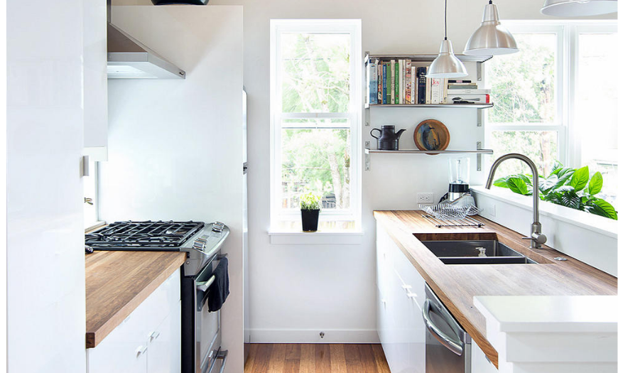 Минимум декора, простая, но функциональная мебель, монохромная светлая цветовая гамма, много света и наличие хоть какого-нибудь свободного пространства визуально раздвинет границы даже самой маленькой кухни.