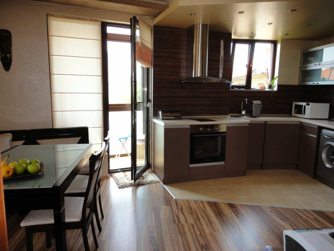 Небольшое расстояние между боковыми стенами и балконная дверь в торце не позволяют разместить обеденный стол посередине, потому его придвигают к стене ближе к балкону, а то и вовсе располагают на балконной территории, если позволяет площадь и произведено качественное остекление и утепление.