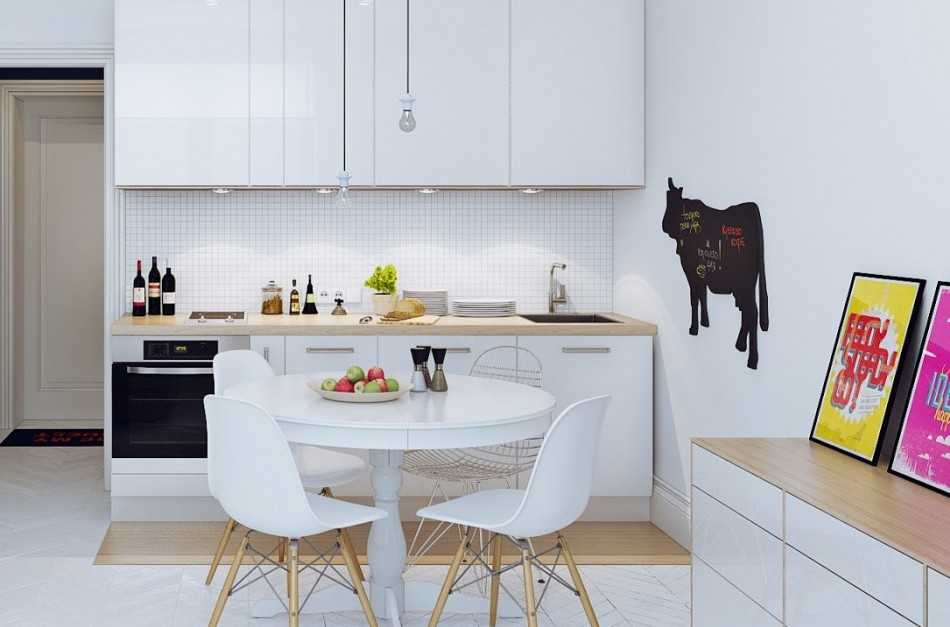 Идеальным решением для небольших помещений считается скандинавский стиль. Основным тоном для оформления стен является белый цвет. Также могут быть использованы нежные оттенки бежевого и серого цветов. Кухонный гарнитур изготавливают из натурального дерева. Его цвет должен контрастировать с цветом стен.
