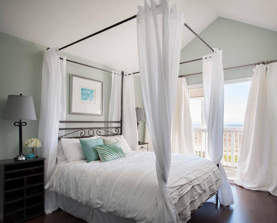 Если его в вашей спальне мало, попробуйте заменить шторы и повесить вместо них легкие тюлевые или полупрозрачные занавески белого цвета. Также можно будет дополнить их светонепроницаемыми жалюзи для того, чтобы ночью можно было легче уснуть. Днем их задействовать нет необходимости.