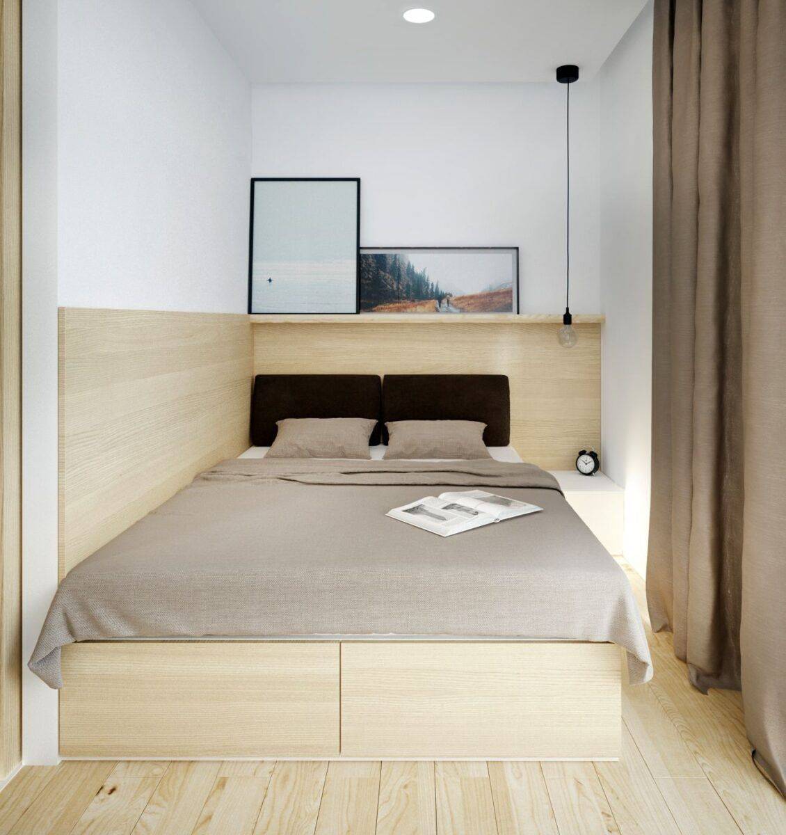 Кровать лучше поискать со встроенными ящиками: в них можно хранить постельное белье и домашнюю одежду.