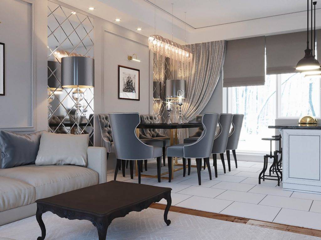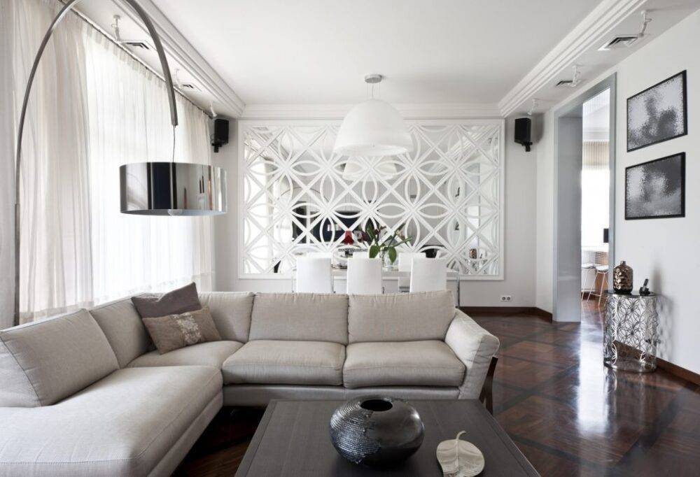 Зеркальные поверхности оживляют интерьер зала, прекрасно отражают свет и приумножают его количество, добавляя комнате безграничного простора.